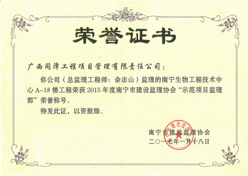 南寧生物工程技術中心A-1#樓項目榮獲2015年度“示范項目監理部”榮譽稱號
