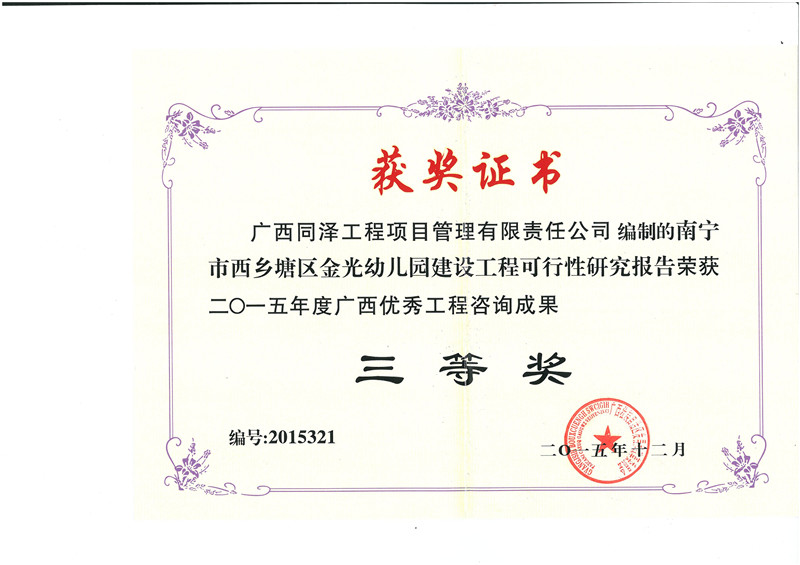 南寧市西鄉(xiāng)塘區(qū)金光幼兒園建設(shè)工程可行行研究報告榮獲2015年度廣西優(yōu)秀工程咨詢成果三等獎