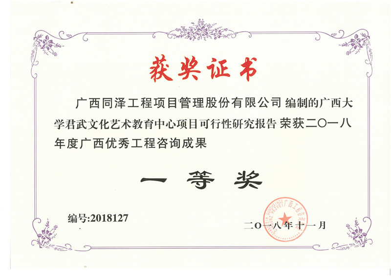 廣西大學君武文化藝術教育中心項目可行性研究報告榮獲2018年度廣西優秀工程咨詢成果一等獎